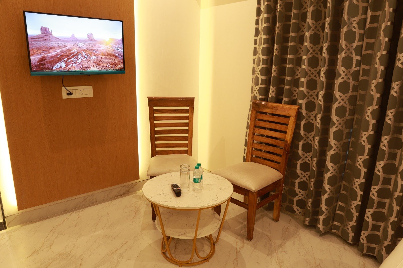 Enjoy a quiet moment in our charming seating corner, complete with elegant wooden chairs, a stylish center table, and a wall-mounted TV. Ideal for sipping coffee, reading, or simply relaxing after a long day, this corner adds a touch of comfort and homely warmth to your stay.